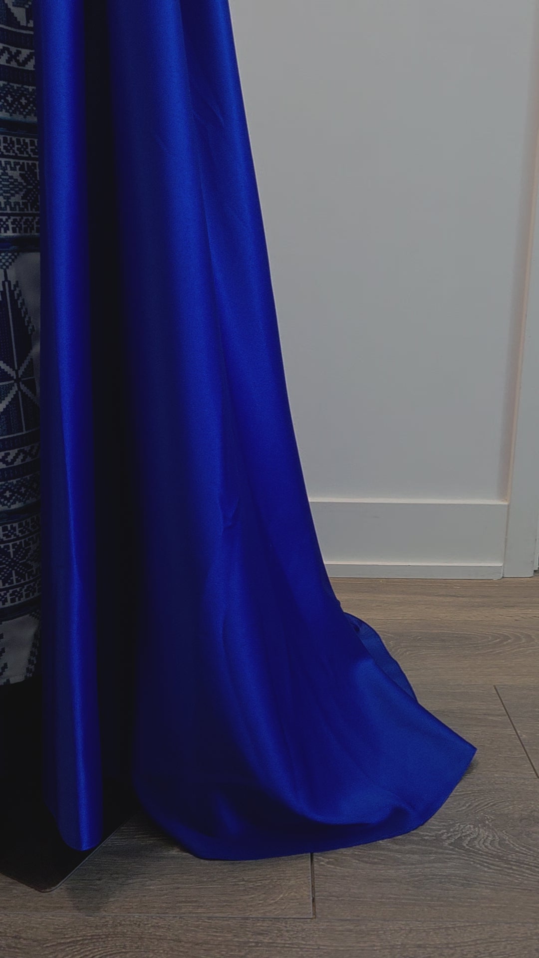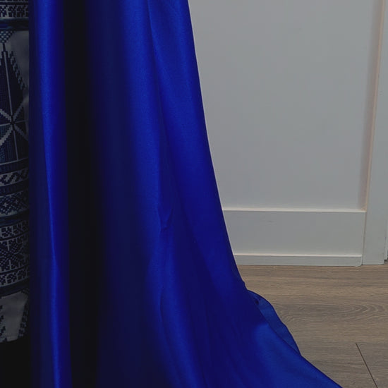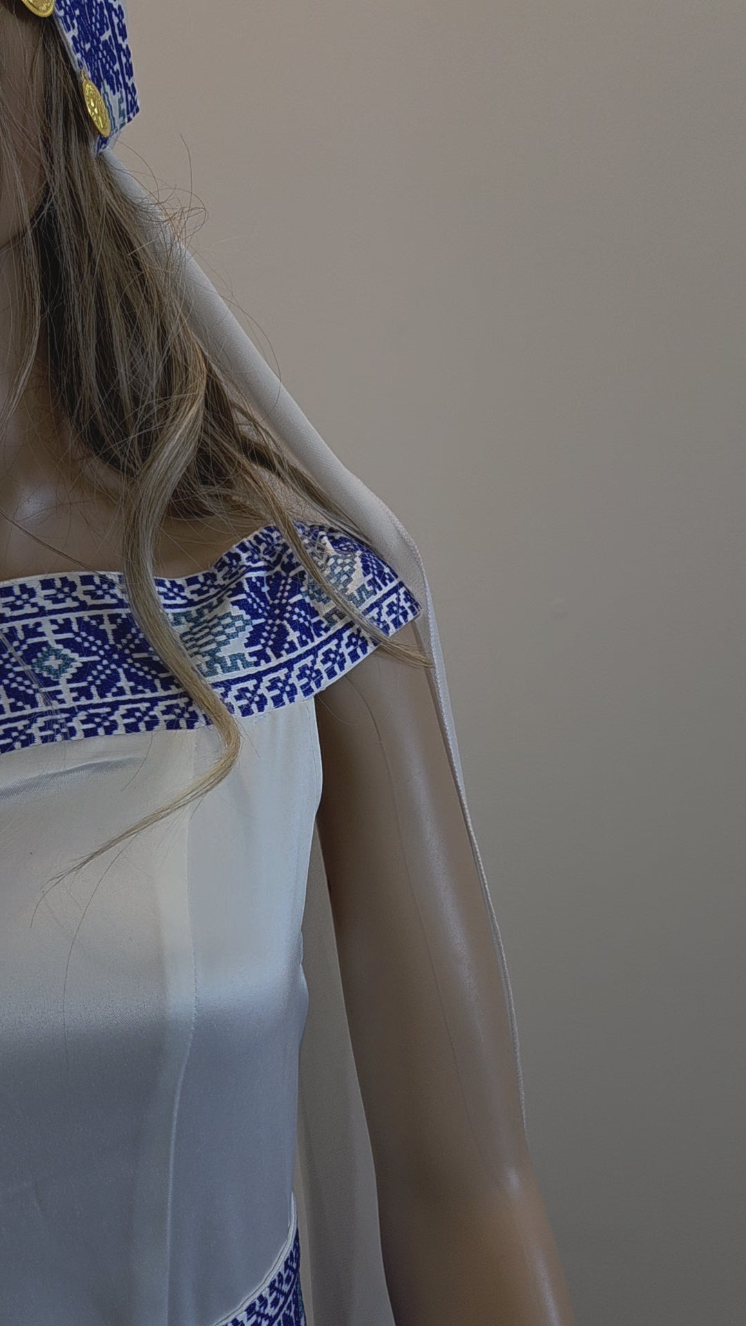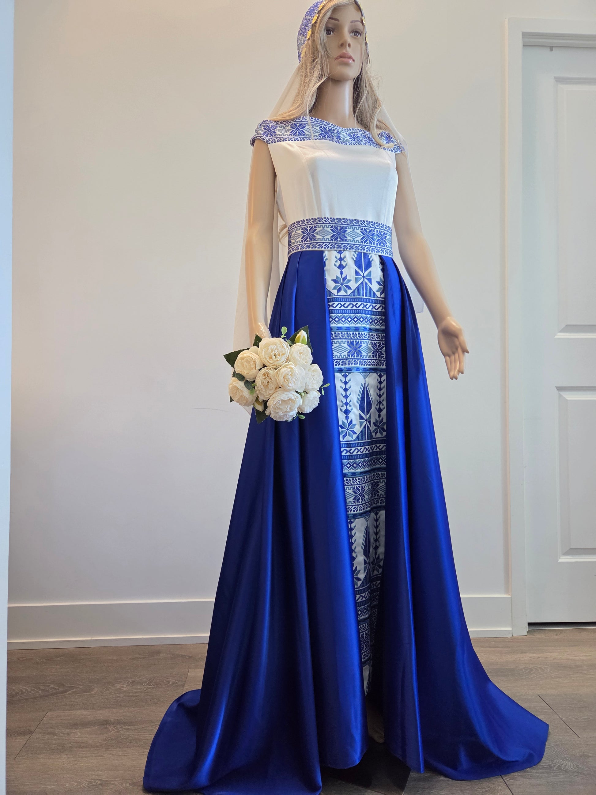 Yaffa Thobe - Blue and White Bridal sleeveless long Tail Thobe dress (Embroidered Tatreez Palestinian Jordanian Thobe)