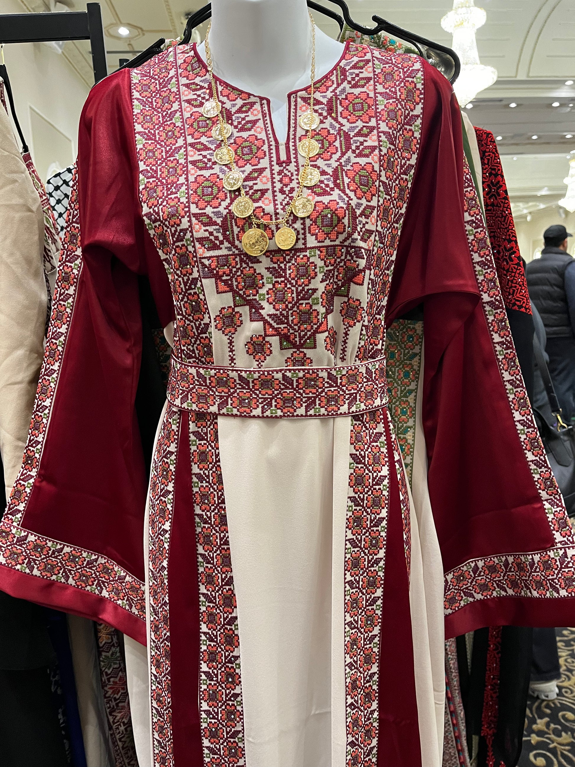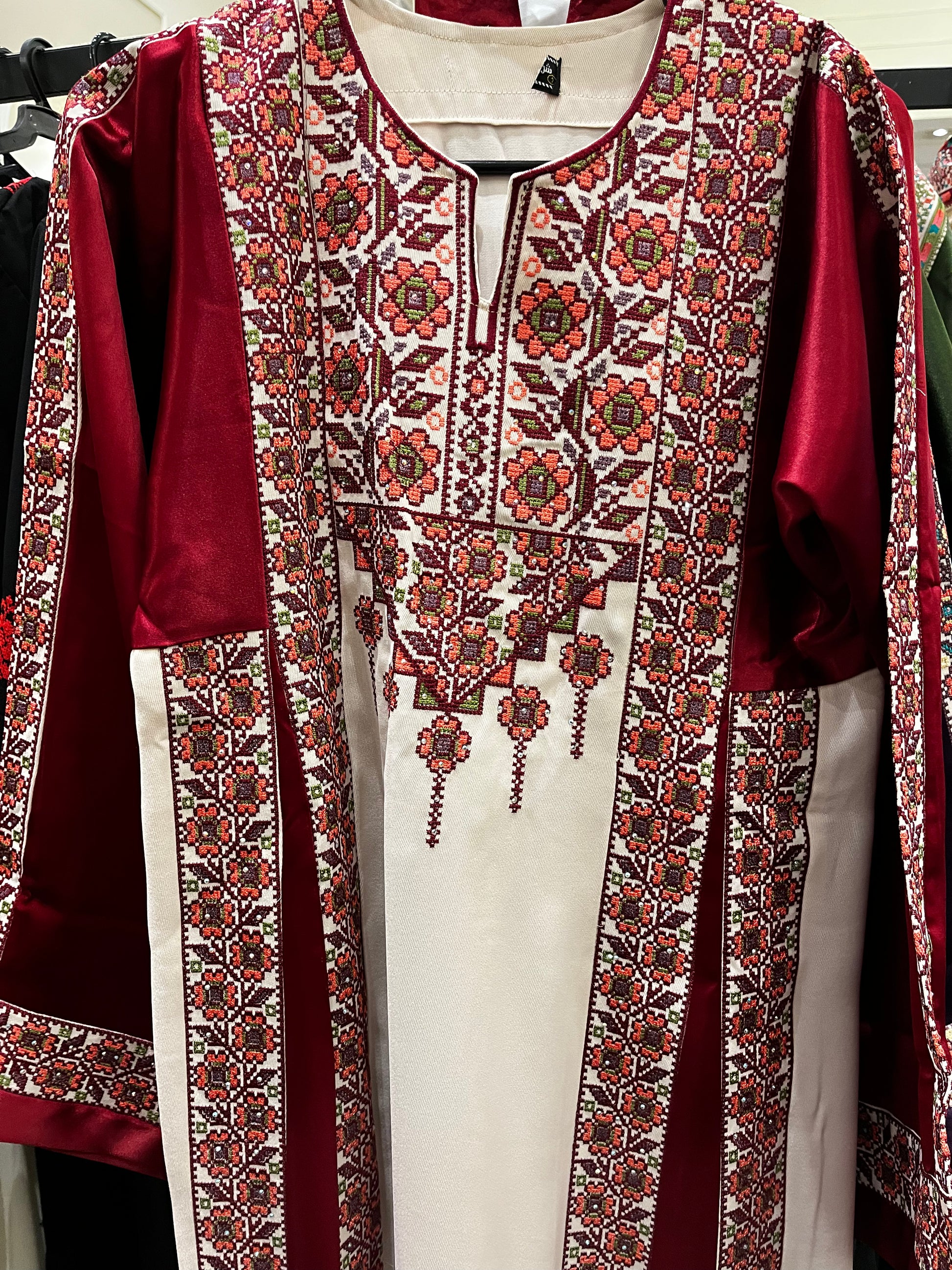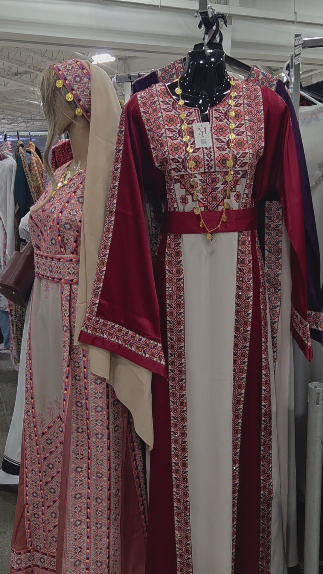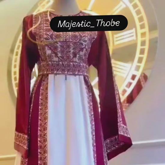 Burgundy With Flowers & Sparkle Traditional Long Sleeve Full Embroidered Palestinian Thobe/Dress