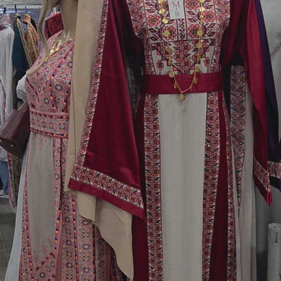 - NEW Collection Beige/Burgundy Diamond Long Full Embroidered Thobe.