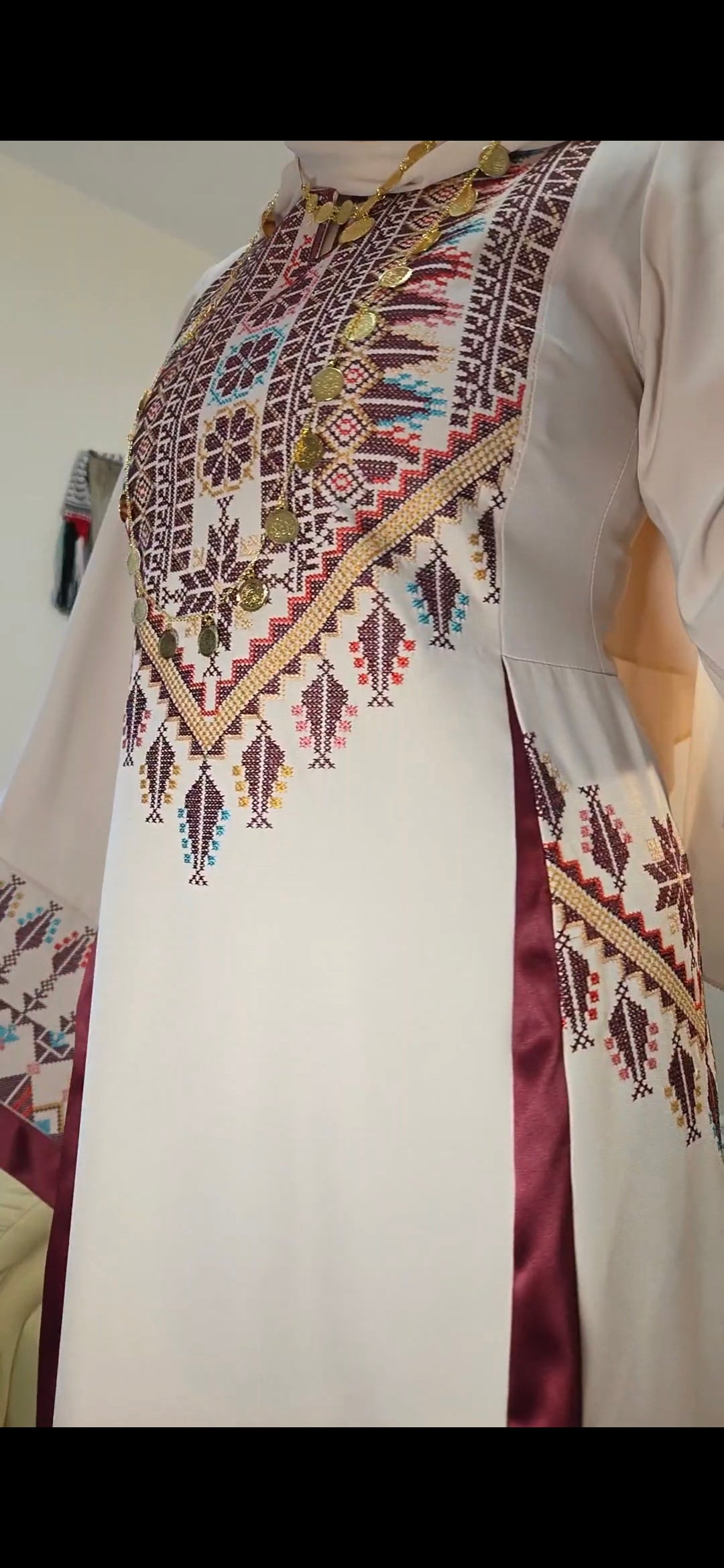 - Long Full Palestinian Embroidered Thobe With Satin.