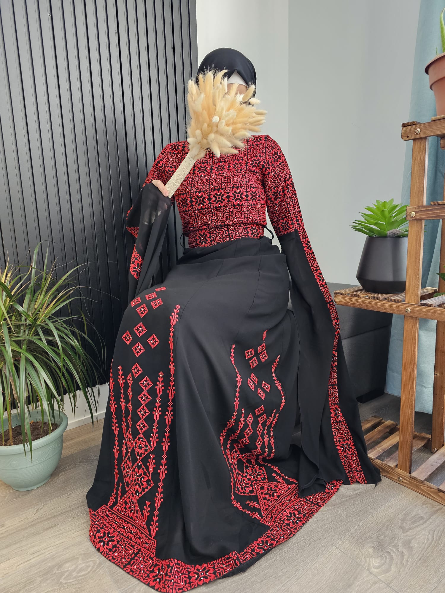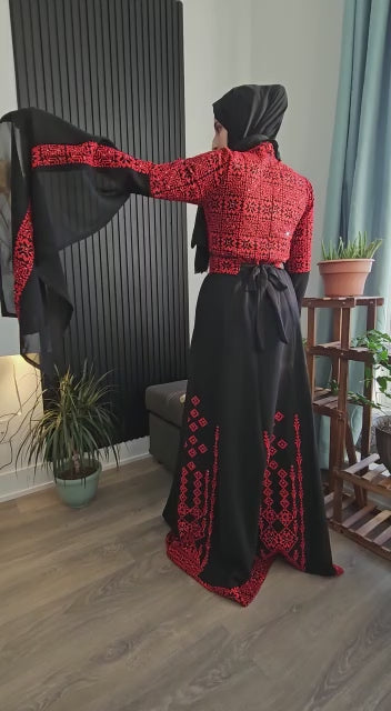 Red & Black Full Embroidery Palestinian Thobe with Extra Long Sleeves - Al Ramallah